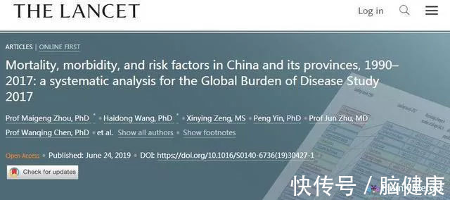 由中国疾病预防控制中心与美国华盛顿大学健康测量及评价研究所(IHME)合作完成,2019年6月发表在国际权威医学杂志《柳叶刀》的一篇论文显示:2017年中国人的十大死亡原因,分别是:中风、缺血性心脏病、呼吸系统 (气管、支气管、肺) 癌症、慢性阻塞性肺病、肝癌、道路交通伤害、胃癌、阿尔兹海默症及其它痴呆症、新生儿疾病和高血压性心脏病。