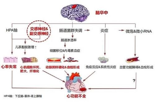 中风后,交感神经系统会再次被激活,导致或加重心功能不全。当然,中风后心功能不全可能由多种机制引起,包括HPA轴(下丘脑-垂体-肾上腺轴)激活、交感和副交感神经调节、儿茶酚胺激增、肠道菌群失衡、免疫反应和系统炎症以及微泡释放和 microRNA(图 2)。