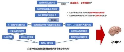 交感神经过度兴奋(以血压升高、心率加快等形式)会释放过量的儿茶酚胺,与受体结合并发生一系列酶促反应,从而改变各种离子通道的构型在细胞膜中,产生大量的钠离子和钙离子。钾的流入和流出可引起各种心律失常(心房颤动等),这也是中风的危险因素(图1)。